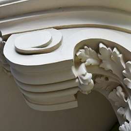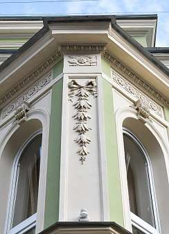Кропотливые работы по реставрации коснулись и лепного декора: произведена догипсовка фрагментов и заделка выбоин, выполнена шлифовка поверхностей, укрепление грунтовкой и окраска.
